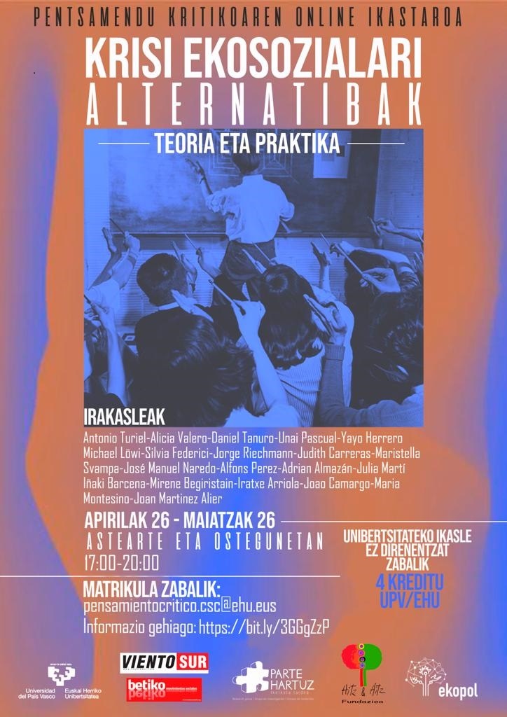 Aipatutako Politika eta Administrazio Zientzien Sailarekin batera, ikastaroa Viento Sur, Betiko eta Hitz&Hitz fundazioek eta UPV/EHUko EKOPOL eta Parte Hartuz ikerketa taldeek antolatu dute.