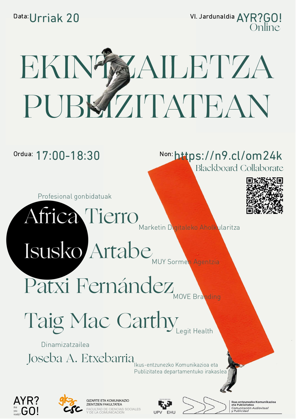 2020ko urriaren 20an egingo da AYR?GO! (Are You Ready? Go!) ren VI. edizioa, bertan gure fakultadeko ikasle izan diren África Tierro, B2B enpresentzako marketing digitaleko kontsultoria propioa duen profesionala, Isusko Artabe, Muy agentziaren sortzaile eta kreatibo nagusi dena, Taig Mac Carthy, Legit Healthen sortzaile eta sektorean hainbatetan autonomo bezela egon dena eta azkenik ere Patxi Fernandez, Move Branding eta Boga Flysharing agentzien sortzailea, izango ditugu hizlari gradua eta gero haien lan mundurako trantzisioa eta agentzia mota desberdinekin esperientzia nolakoa izan den inguruan Joseba Etxebarria Gangoiti, gure fakultadeko Ikus-entzunezko Komunikazio eta Publizitatea departamentuaren irakasle, dinamitzaile izango dugu BB Collaborate plataformaren bidez.