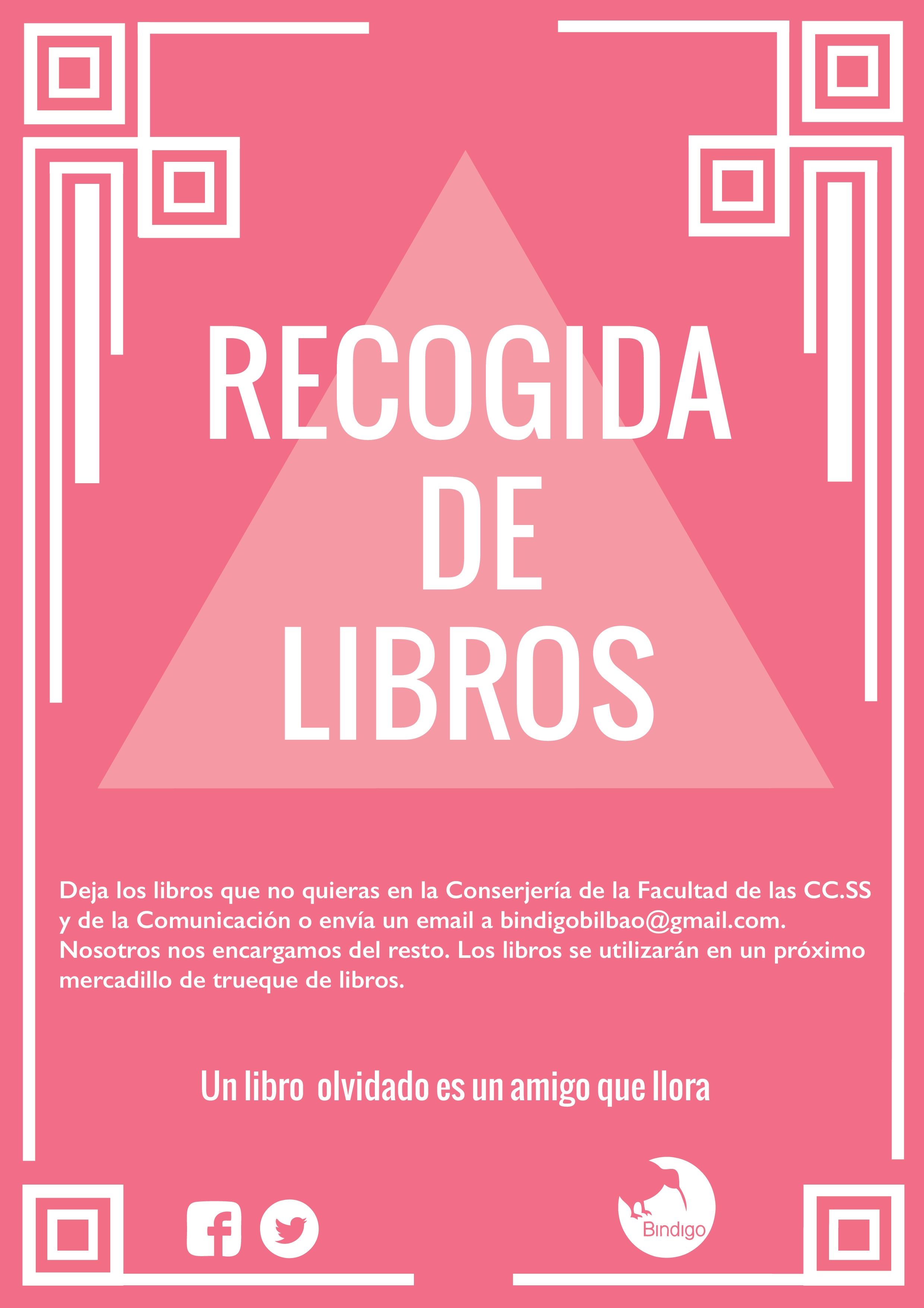 Deja los libros que no quieras en la Conserjería de la Planta 0 de la Facultad de las Ciencias Sociales y de la Comunicación, y dales una segunda vida. Deja tantos libros como desees, del tipo que quieras: novela, de cocina, de viaje… Los libros donados se utilizarán en un mercadillo de trueque de libros los días 21 y 22 de marzo en el mercadillo Zawp Craft en Zawp (Iturriko Kalexka, Bilbao). También puedes enviarnos un e-mail a bindigobilbao@gmail.com y nos acercamos a recogerlos.