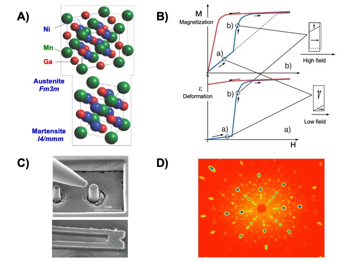 The large energy per unit mass of these materials makes them specially interesting for micro and nan o actuators. In this way, thin film cantilevers and sculpted nanopillars are under investigation (fig. C).