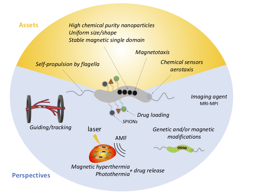MTBs are aquatic microorganisms able to biomineralize membrane-enclosed magnetic nanoparticles and arranged them in a chain that allows the bacteria to align and navigate along the Earths magnetic field. MTB are promising agents for cancer treatment, taking advantage of their capabilities of self-propulsion, provided by the flagella, and guidance, ensured by the magnetic chain while retaining the therapeutic and imaging potential of the magnetic nanoparticles. MTB are envisaged as nanobiots that could be guided by external magnetic fields while are naturally attracted towards hypoxic zones, such as tumor regions, due to the microaerophilic character.