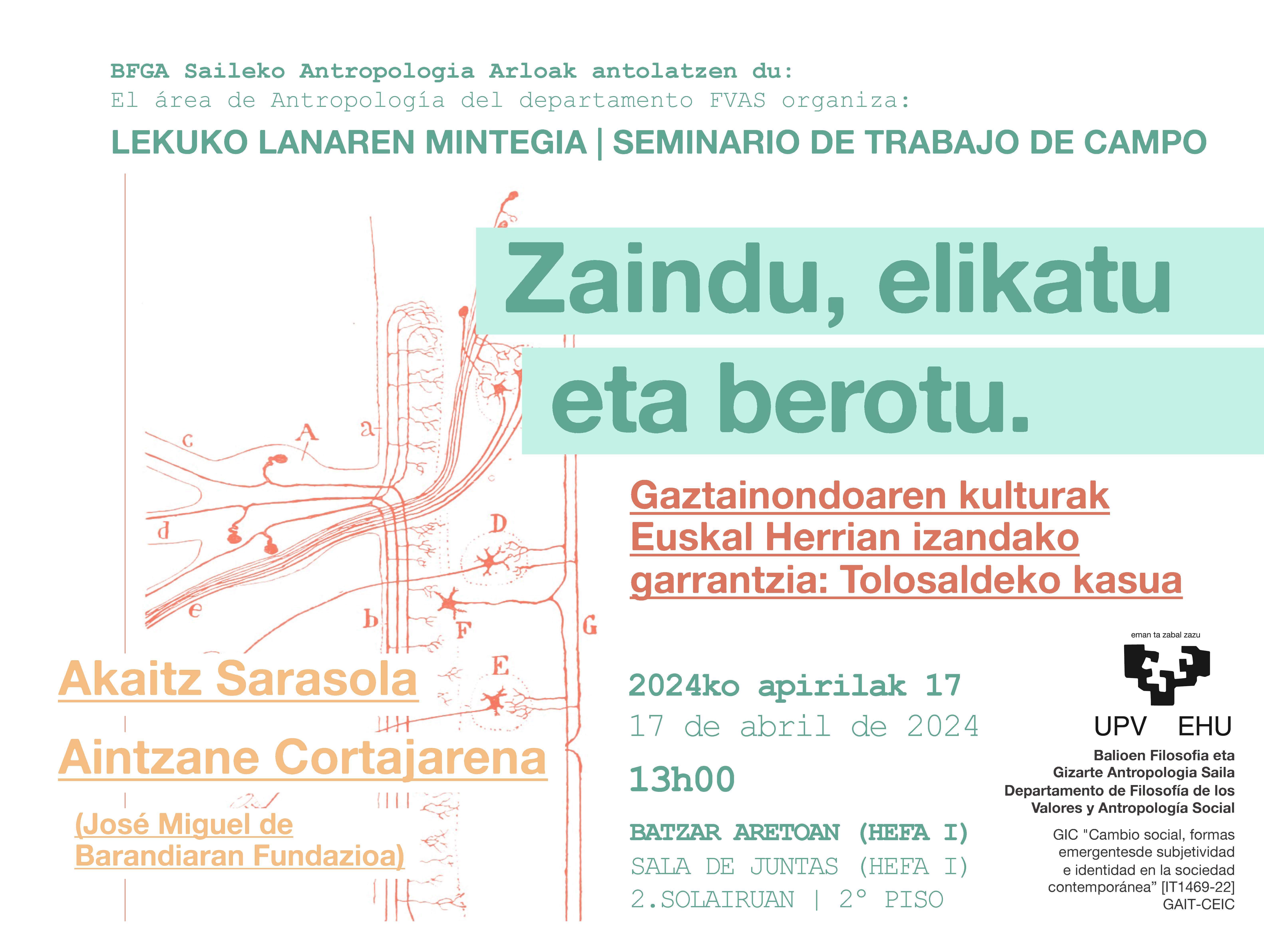 Antropologiaren lekuko lanaren mintegia. Akaitz Sarasola eta Aintzane Cortajarena: Zaindu, elikatu eta berotu.