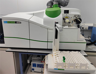 Perkin Elmer NexION 300 ICP-MS Spectrometer with a quartz cyclonic spray chamber, triple cone interface, and a Perkin Elmer S10 autosampler. The ICP-MS can work in two modes of operation: dynamic reaction cell (DRC) or collision cell (KED).