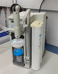 The MilliQ Element MO System (Millipore) allows the purification of water to obtain ultrapure water (resistivity: 18 M Ω/cm) by reducing the concentration of elements to ppt levels. This apparatus allows the use of the water to the analysis of organic compounds and metals at trace levels removing potential interferences.