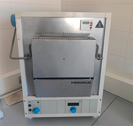 Muffle furnace (Model: Heraeus K114) that reduces heating and recovery times while maintaining accurate temperature control (up to 1100 oC). It is suitable for common applications including materials testing, burning and rapid heat processes.