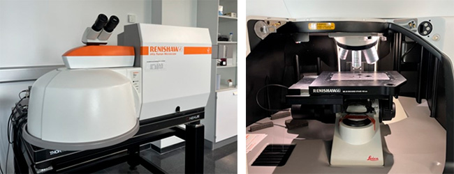 For Raman imaging analyses a Renishaw InVia Raman micro spectrometer is available, coupled to a DMLM Leica microscope with 5x, 20x, 50x and 100x objectives and with a Peltier-cooled (-70 oC) detector. The microscope is equipped with a motorized XYZ positioning stage. Images can be acquired with the 532 and 785 nm laser using the Stream Line device or point by point device. The nominal power of the laser at a maximum is 50 mW and it can be modulated at several percentages. The spectral resolution is around 1 cm-1. The software used for the data collection is the Renishaw Wire 4.1. The equipment is installed on an antivibratory table and inside a temperature-controlled room.