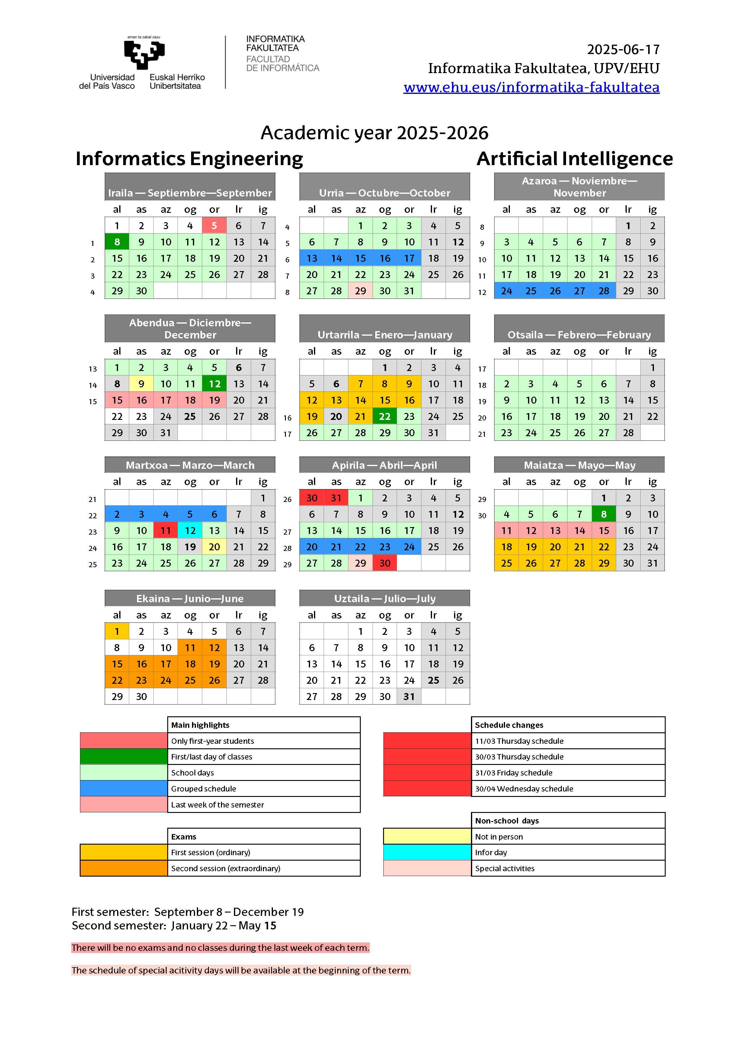 Academic Calendar 2025-26 First semester (Fall semester): September 8 - December 19, 2025 Exams: January 7-21, 2026 Second semester (Spring semester): January 22 - May 15, 2026 Exams: May 18 - June 1, 2022 Second call for exams: June 11-26, 2026