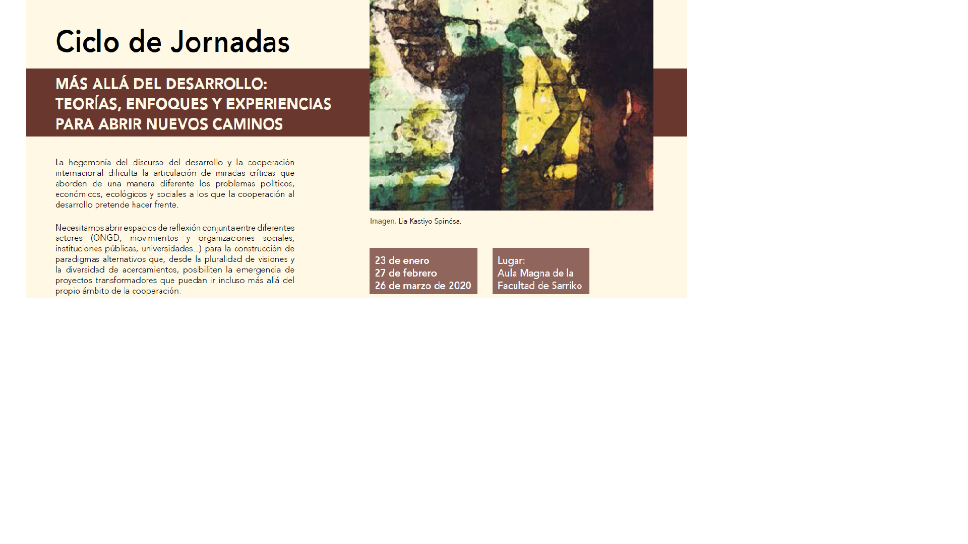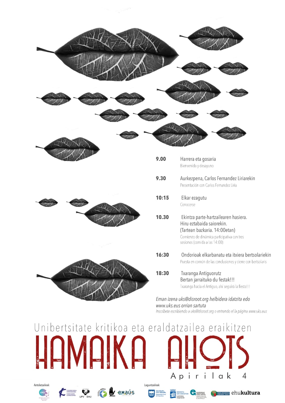 From Unibertsitate Kritikoa Sarea (Critical University Network), where we work together several NGO students and teachers, have organized a conference for April 4 with an all day program. It will be a space for reflection, growth and sharing.