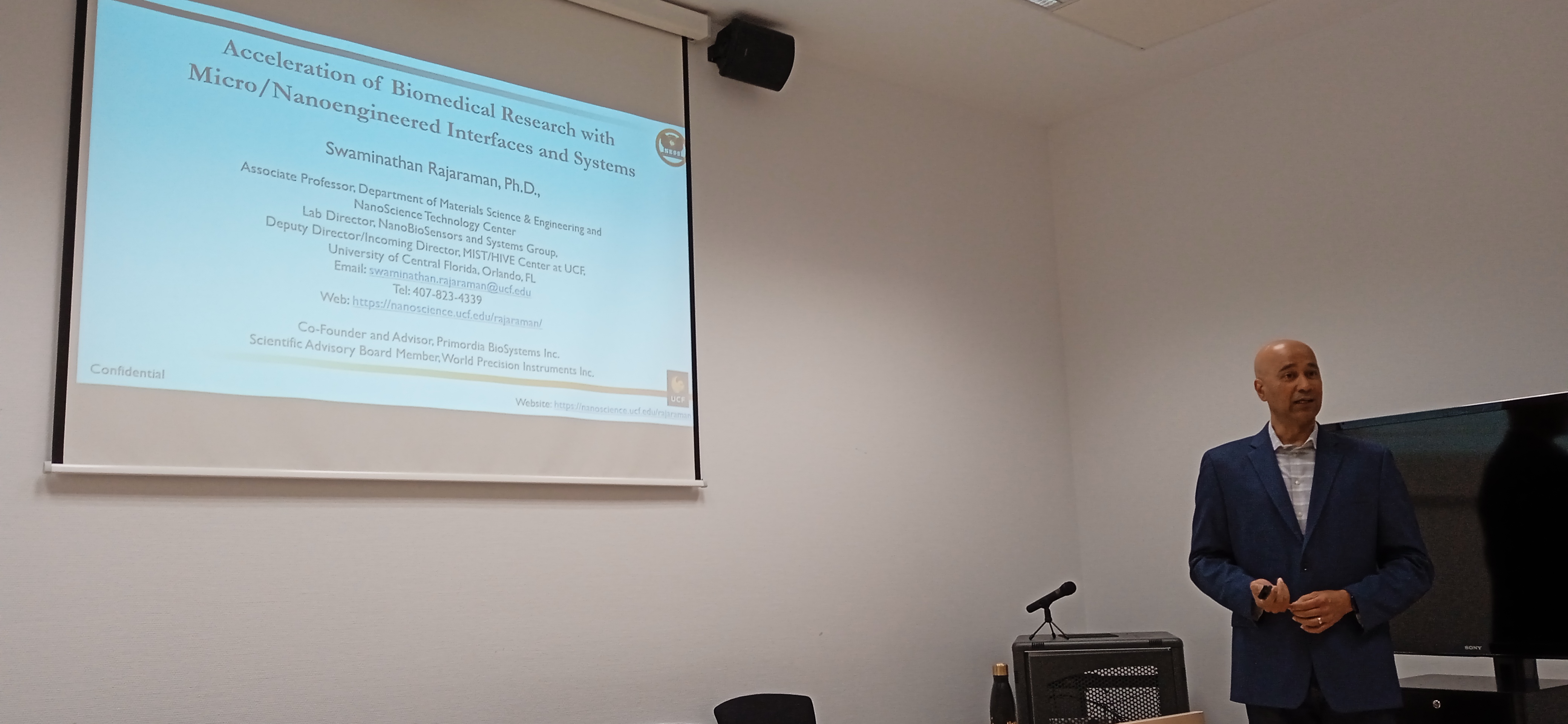 The 20th of September 2024, Prof. Swaminathan Rajaraman, from the Materials Science & Engineering, Electrical & Computer Engineering, Biomedical Engineering, Burnett School of Biomedical Sciences and the Nanoscience Technology Center at University of Central Florida, Orlando, Florida, USA gave a wonderful seminar entitled: Acceleration of Biomedical Research with Micro/Nanoengineered Interfaces and Systems.