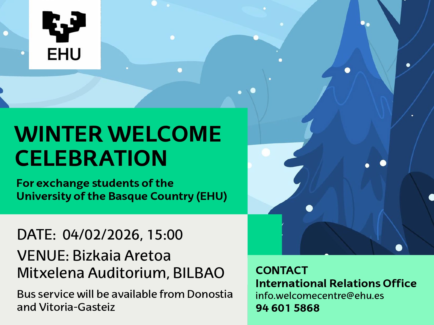 The event will begin at 3 p.m. at the Bizkaia Aretoa building of the University of the Basque Country (EHU) in Bilbao and will consist of an institutional welcome from the Vice-Chancellor's Office for Transfer and Internationalisation, presentations with practical information for your stay, and a lunch with music to finish.