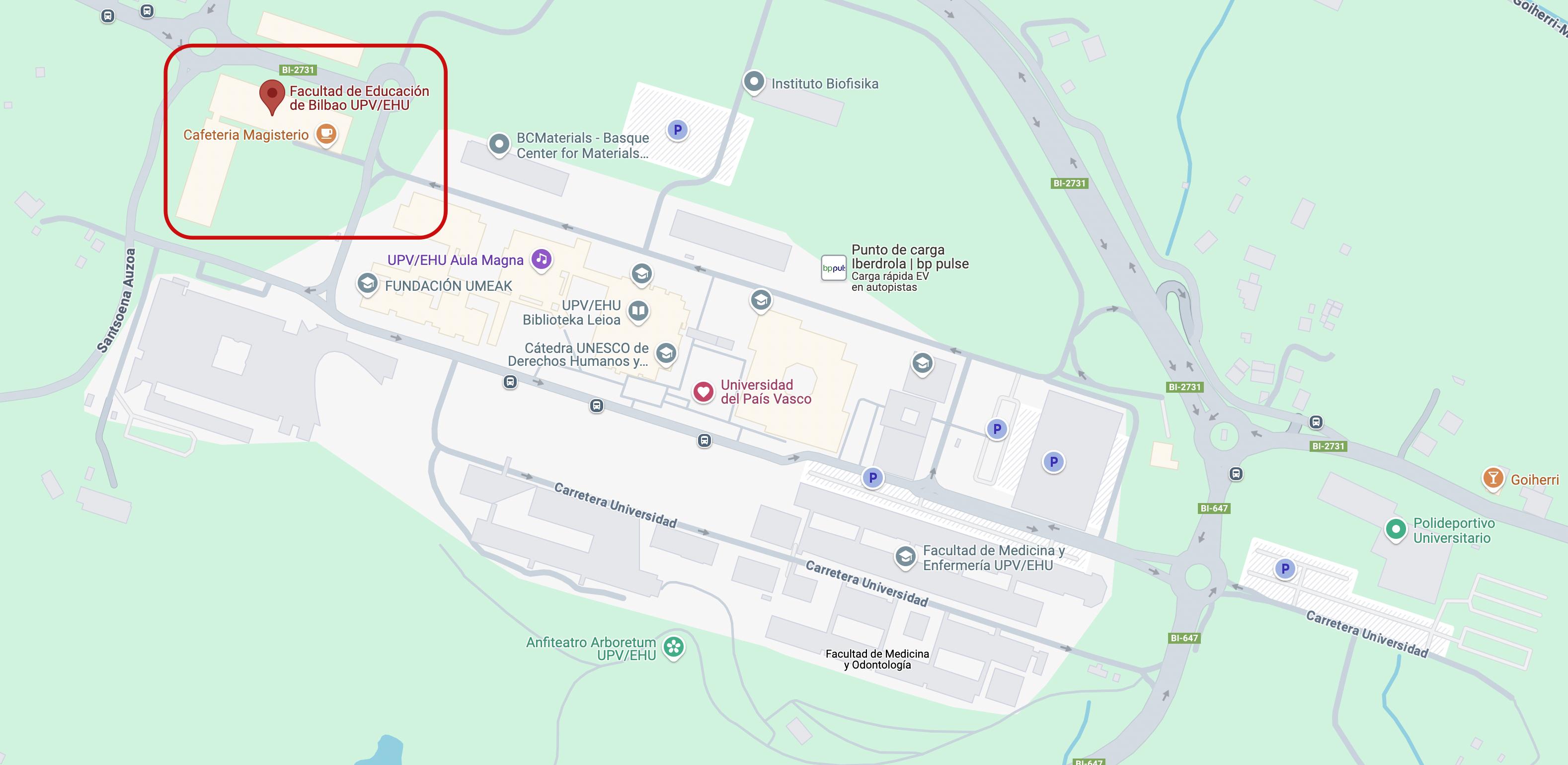 If you are traveling to the campus by car, the link to the location on Google Maps of the Bilbao Faculty of Education is as follows: https://maps.app.goo.gl/o8LKpPXtgHEerrhP9