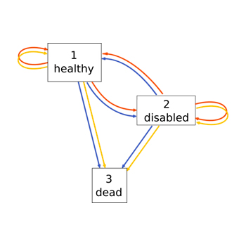 - Tim Riffe, Mauricio Gonzalez-Forero. Attrition-based sensitivity for multistate models of health with large state spaces