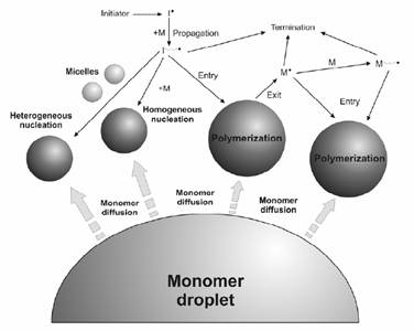 Miniemulsion PolymerizationMiniemulsions are finely divided oil-in-water dispersions stabilized against coagulation by conventional emulsifiers and containing a highly water-insoluble compound (hydrophobe) to minimize the Oswald ripening effect. Monomer miniemulsions can be polymerized upon addition of either water-soluble or oil-soluble initiators leading to a dispersed polymer, somehow similar to a latex produced by conventional emulsion polymerization. The main difference is that in miniemulsion polymerization, particle nucleation occurs by radical entry in submicron monomer droplets. This feature is advantageously used to incorporate highly water-insoluble compounds to the polymer, to produce highly concentrated latexes of reduced viscosity and to achieve stable operations in CSTRs. Future work will focus on both the investigation of key parameters necessary to up-scale miniemulsion processes and on the development of novel and smart materials (see below). |