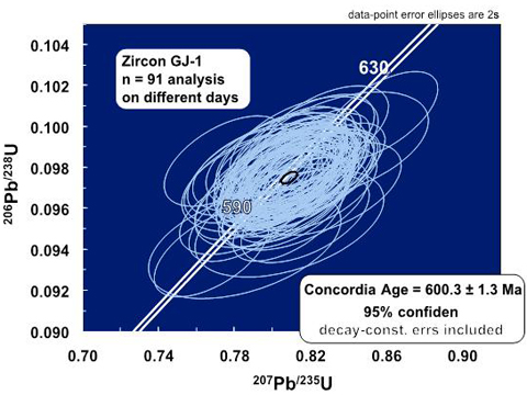Figure 3. Concordia diagram for the zircon standard GJ-1 using data obtained in the Service (ca. 30 µm spots).
