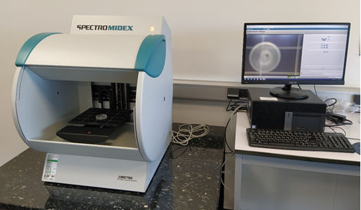 Micro X-ray fluorescence spectrometer using energy dispersion ED-XRF for elemental analysis. It has an automatic XYZ tray, automatic collimator changer, X-ray tube with Mo anode, maximum power 40W; maximum voltage 48kV and silicon drift detector (SDD) with an area of 30mm2, and FWH energy resolution lower than 150eV, measured on the Mn Kalfa line. Its calibration is through fundamental FP Plus parameters.