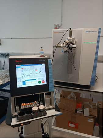 Description: The EASY-nLC 1200 UHPLC system offers maximum performance for nano LC MS/MS applications and is connected to the mass spectrometer via the NanoSpray Flex NG ion source. The Orbitrap Exploris 240 is a compact quadrupole Orbitrap mass spectrometer suitable for most proteomic analyses.