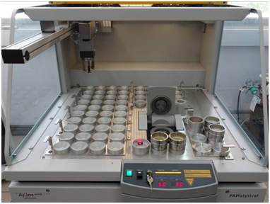 - Panalytical Axios mAX advanced, Sequential Fluorescence Sequence X-ray Wavelength (WDXRF), equipped with automatic sample changer, vacuum measurement system, Rh tube and three detectors (gas flow, scintillation and sealing of Xe).