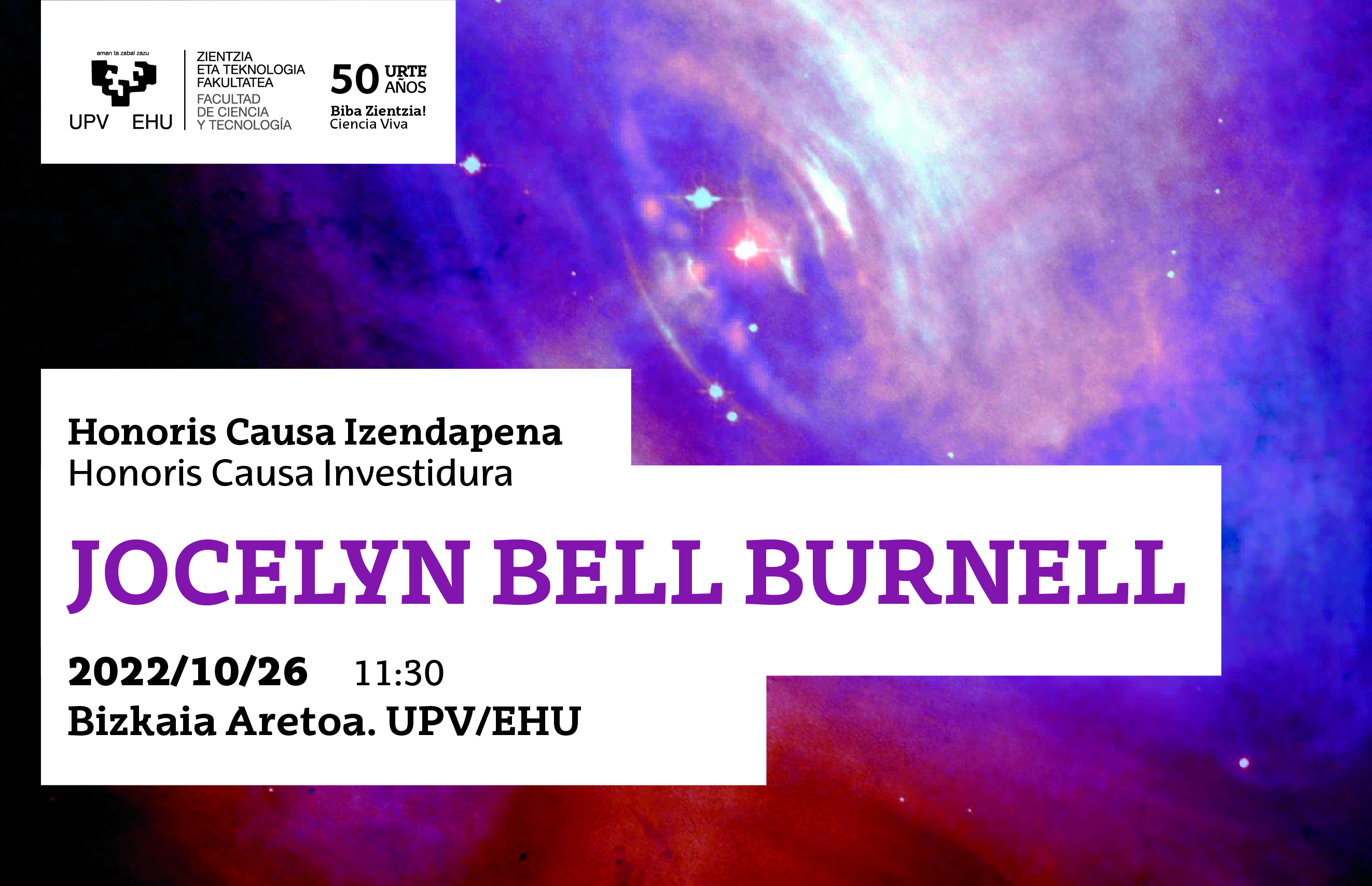 Honoris Causa Izendapena: JOCELYN BELL BURNELL Date 26/10/2022 Location LocationBizkaia AretoaAvenida Abandoibarra 3. -48009- Bilbo (Bizkaia) Share to Facebook - (Opens New Window) Share to Bluesky - (Opens New Window) Share to Linkedin - (Opens New Window) Share to Whatsapp - (Opens New Window) Share to Telegram - (Opens New Window) Send by email - (Opens New Window) Copy Link - (Opens New Window) 2022/10/26 11:30 Bizkaia Aretoa. UPV/EHU