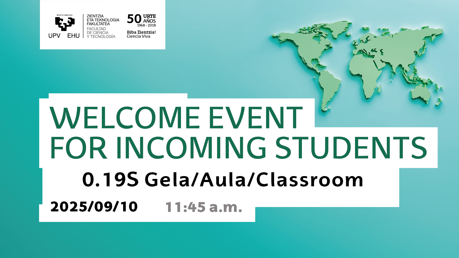 Presentation Welcome Event for Incoming Students Date 10/09/2025 Share to Facebook - (Opens New Window) Share to Bluesky - (Opens New Window) Share to Linkedin - (Opens New Window) Share to Whatsapp - (Opens New Window) Share to Telegram - (Opens New Window) Send by email - (Opens New Window) Copy Link - (Opens New Window) Welcome Event for Incoming Students 0.19S Gela / Aula / Classroom 2025/09/10 11:45 a.m. Zientzia eta Teknologia Fakultatea