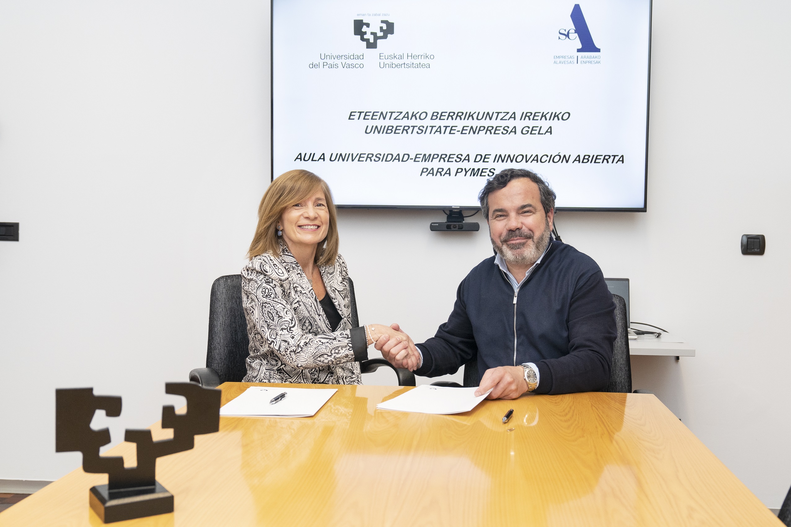 Manoli Igartua Olaechea, vicerrectora del Campus de Álava de la Universidad del País Vasco, y Pascal Gómez Pérez de Zuazagoitia, presidente de SEA, han firmado un Convenio de colaboración entre la Universidad del País Vasco y la asociación empresarial SEA-Empresas Alavesas para la creación del Aula Universidad-Empresa de innovación abierta para pymes. Dicha Aula tiene como finalidad la realización de actividades formativas, investigadoras, de innovación y transferencia del conocimiento en colaboración con las empresas asociadas a SEA.