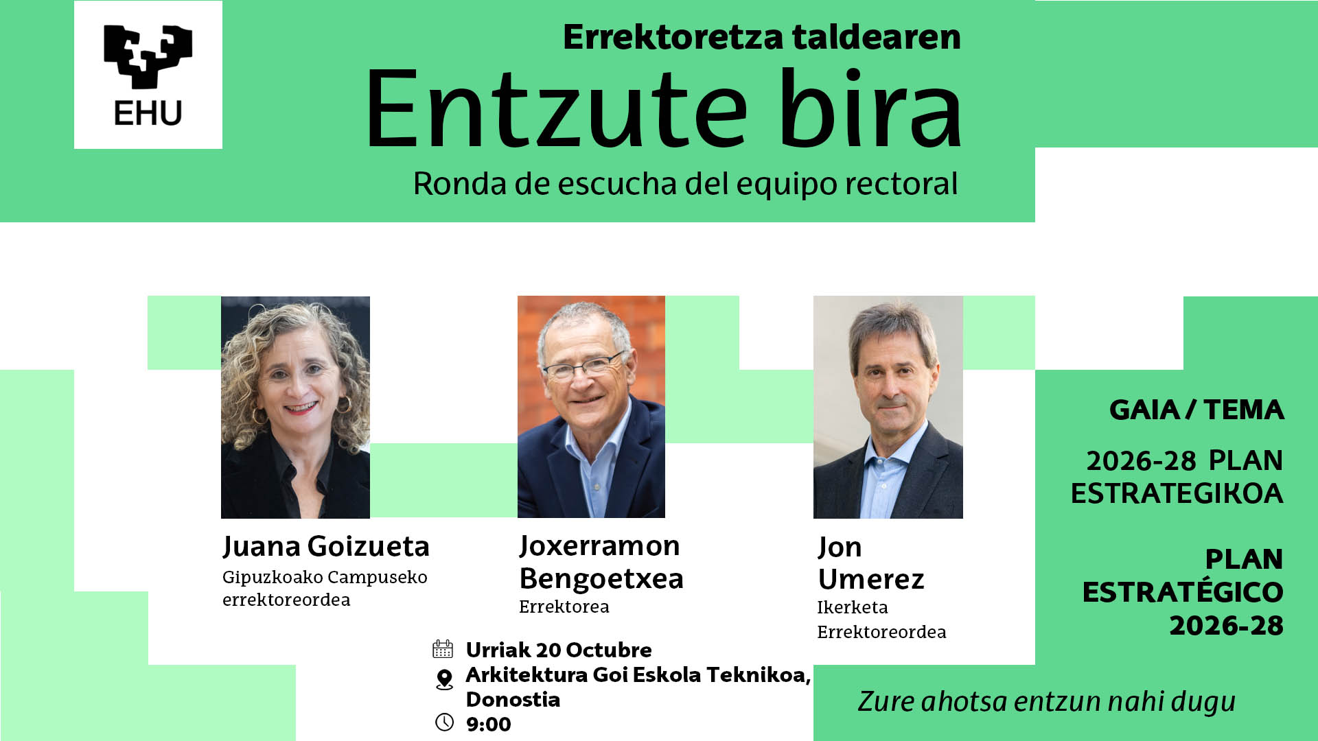 Ronda de escucha del equipo rectoral Fecha 20/10/2025 Compartir en Facebook - (Abre una nueva ventana) Compartir en Bluesky - (Abre una nueva ventana) Compartir en Linkedin - (Abre una nueva ventana) Compartir en Whatsapp - (Abre una nueva ventana) Compartir en Telegram - (Abre una nueva ventana) Enviar por correo electrónico - (Abre una nueva ventana) Copiar enlace - (Abre una nueva ventana) Tema: PLAN ESTRATÉGICO 2026-28 Dia: 20 de octubre (lunes) Hora: 9:00h. Lugar: en el Paraninfo de la Escuela Técnica Superior de Arquitectura