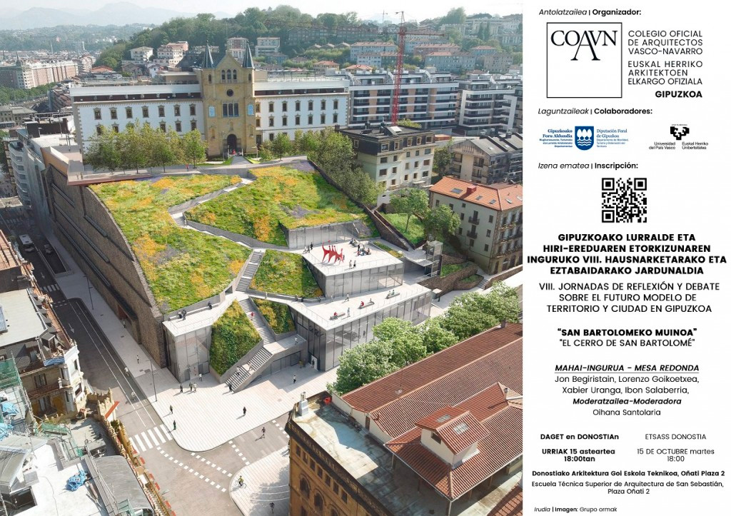 Ya está en marcha la VIII Jornada de reflexión y debate sobre el futuro modelo de territorio y ciudad de Gipuzkoa que organiza la comisión de Cultura del COAVN Gipuzkoa, y que girará en torno al Cerro de San Bartolomé, de Donostia/San Sebastian. Esta jornada arrancará con una mesa redonda en la que, entre otros temas, se abordarán la gestión urbanística, la movilidad, el patrimonio, el comercio o el impacto medioambiental.