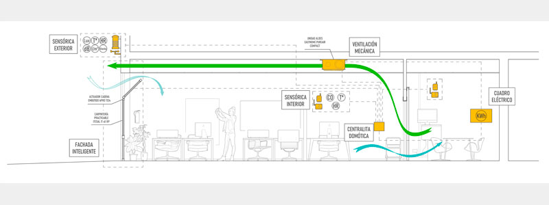 Investigación en el diseño de sistemas de ventilación que permitan un uso racional del aire exterior (siempre que las condiciones ambientales exteriores lo permitan), mediante una gestión inteligente de la apertura y cierre de las ventanas y su coordinación con los sistemas de ventilación doméstica mediante sistemas domóticos que midan en tiempo real la calidad del aire. El objetivo es conseguir buenos ratios de ventilación y calidad del aire sin comprometer el consumo energético, además de aumentar el confort de verano y una mayor conexión con el ambiente exterior.