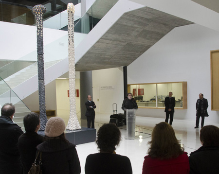 Por su parte, el rector Goirizelaia ha señalado que "esta escultura viene a significar un puente que une dos orillas. En una está la Universidad Vasca de 1936 y, en la otra, Universidad del País Vasco/Euskal Herriko Unibertsitatea. No somos dos universidades diferentes a las que separan 77 años de historia. Se trata de la prolongación de un mismo proyecto universitario que, con este símbolo, contribuimos a preservar".