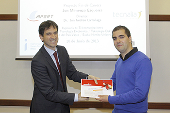 La Escuela Técnica Superior de Ingeniería de Bilbao ha entregado hoy el premio al mejor proyecto de fin de carrera, que patrocina Accenture. Este año, el premio ha recaído Jon Mimenza, estudiante de la titulación de Ingeniería de Telecomunicación, que ha elaborado un trabajo que fomentará el desarrollo de las energías renovables y del transporte sostenible, a través de una mejora en la gestión de las 'electrolineras', los puntos de recarga de los vehículos eléctricos. Se trata de la decimocuarta edición de este galardón, que está dotado con un premio en metálico de 1.800 euros.