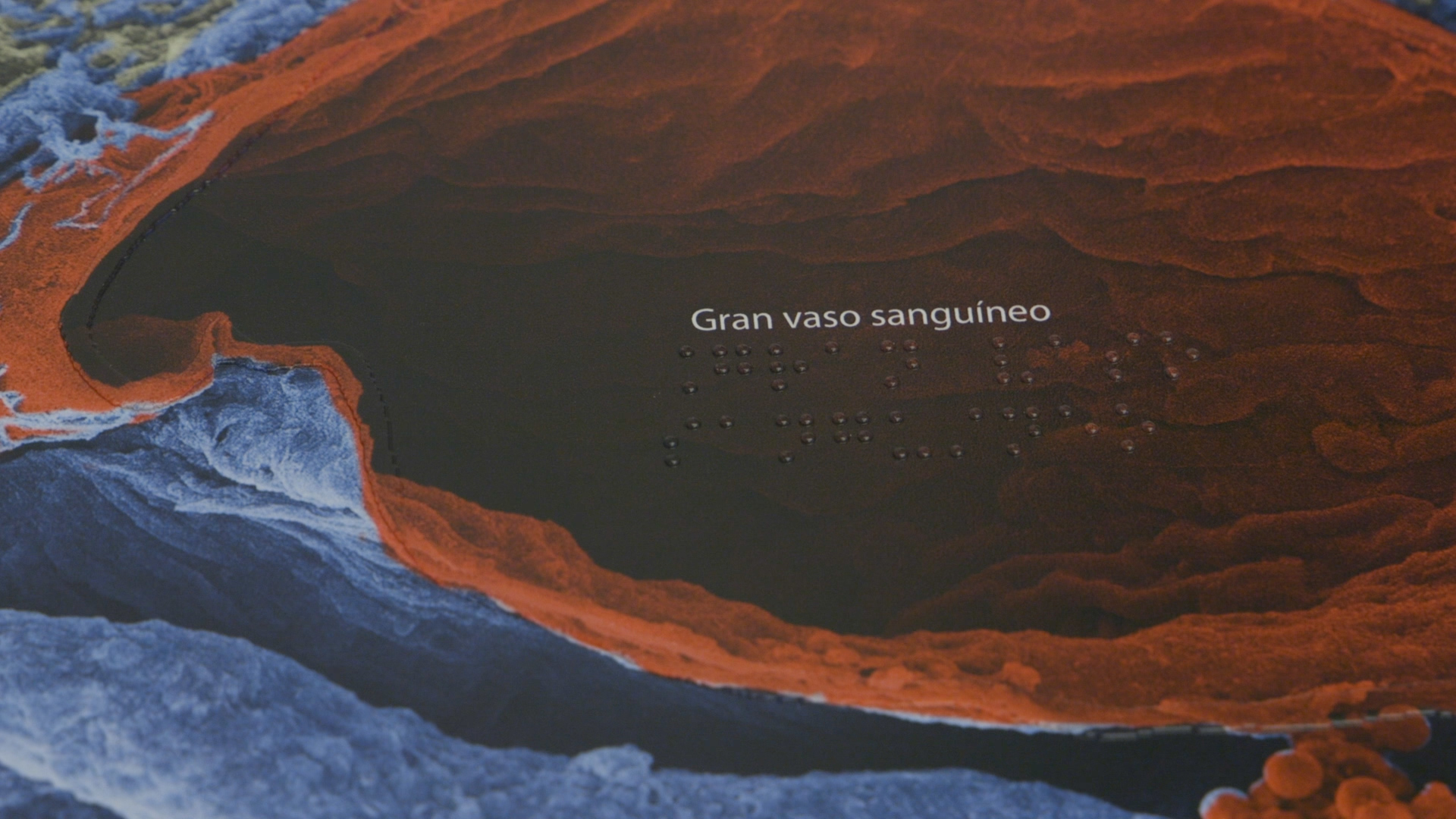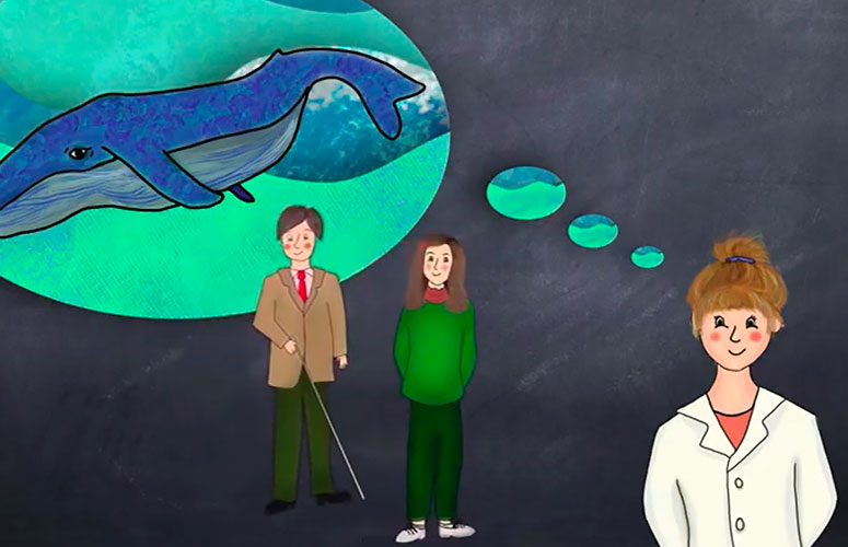 Vecino es especialista en glaucoma y otros problemas oculares que provocan la ceguera. Y ello no podía dejar de reflejarse en la exposición: además de las 16 fotografías y vídeos obtenidas durante la investigación, las dos maquetas y el gran panel con la ballena impresa, la muestra se ha adaptado a las personas con dificultades de visión; para ello han impreso en relieve las imágenes y dispuesto paneles explicativos en Braille. “Conseguir adaptar estas imágenes es lo que más ha costado”, reconoce la organizadora de la exposición.