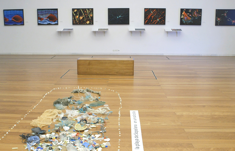 Al lado de la maqueta de la ballena, reposan plásticos y otro tipo de residuos recogidos a lo largo de un día en la playa de Sopelana, que quieren representar la contaminación y los peligros a los que están sometidos los animales. “Ese tipo de plásticos pudieron ser el alimento de la ballena, la causa de su extrema delgadez y, quién sabe, quizá de su muerte”, medita la investigadora. Con ello como eje central de la muestra Elena Vecino quiere también concienciar hacia la ecología, la limpieza y el respeto a los mares”.