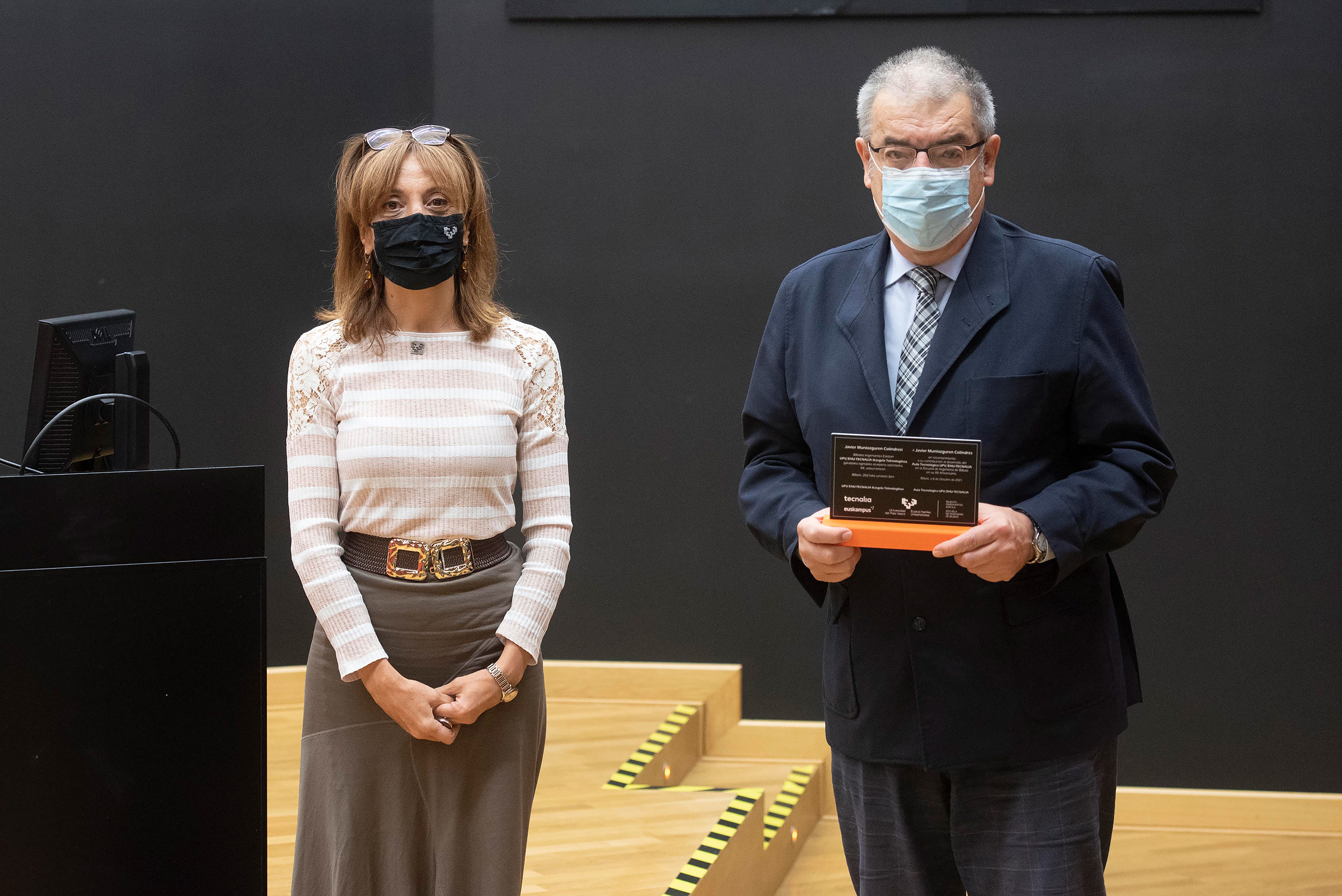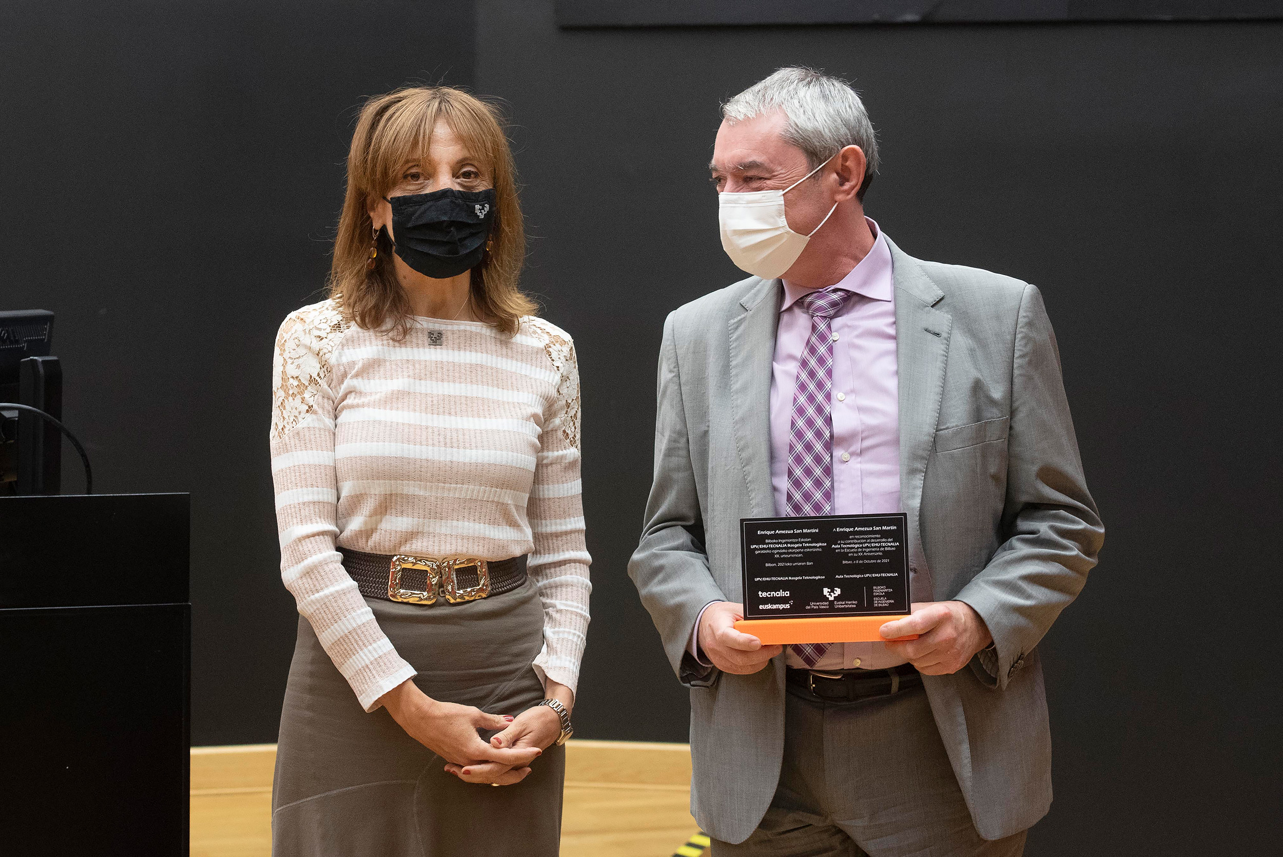 Enrique Amezua (ex director de la EIB) recibe el reconocimiento de la mano de Eva Ferreira. FOTO: Fernando Gómez. UPV/EHU -