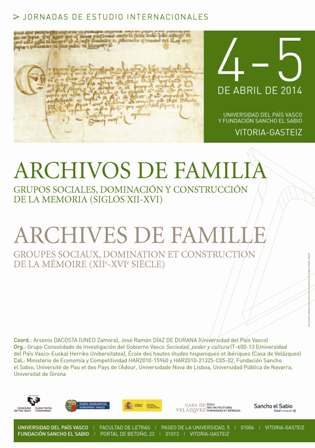 Los días 4 y 5 de abril se celebran en la Facultad de Letras de la Universidad del País Vasco/Euskal Herriko Unibertsitatea y en la sede de la Fundación Sancho el Sabio de la Obra Social de Caja Vital las V Jornadas de Estudio Internacionales dedicadas a 'Archivos de familia: grupos sociales, dominación y construcción de la memoria'. Organizadas por el Grupo Consolidado de Investigación del Gobierno Vasco 'Sociedad, poder y cultura' (UPV/EHU), y L'École des hautes études hispaniques et ibériques (Casa de Velázquez), en colaboración con el Ministerio de Economía y Competitividad, la Fundación Sancho el Sabio, Université de Pau et des Pays de l'Adour, Universidade Nova de Lisboa, Universidad Pública de Navarra y Universitat de Girona, tienen como objetivo poner en evidencia los vínculos complejos entre los archivos y las familias en el momento de la génesis de los fondos y el papel de los mismos en la construcción de la historia.