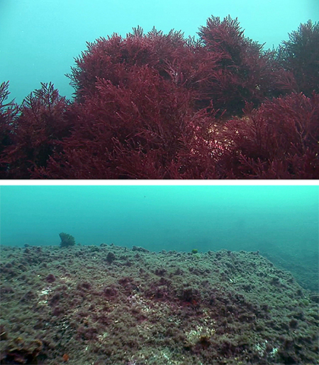 De tamaño grande, color rojizo y que crece en las zonas más batidas por las olas, el alga Gelidium corneum juega un papel esencial en el funcionamiento del ecosistema costero. Actúa como refugio, lugar para la puesta de huevos y hogar de muchos animales y algas. La Gelidium necesita unas condiciones muy particulares para su supervivencia. Sin embargo, según ha constatado el Grupo de Investigación de la UPV/EHU, en las últimas décadas las condiciones climáticas han variado notablemente. El agua ha sufrido un calentamiento en las tres últimas décadas con un incremento promedio en agosto de 1ºC, pasando de 22ºC a 23ºC. Además, se han dado veranos especialmente cálidos con registros de temperatura del agua no alcanzados con anterioridad (un máximo de 26,2ºC en agosto de 2003). La radiación solar ha aumentado, incrementando los niveles de estrés de las algas que adoptan colores amarillos e incluso blancos en vez de su color rojo oscuro natural, y el nivel de nutrientes de las aguas ha disminuido, debido a los cambios en el afloramiento y a la escasez de aguas procedentes de los ríos. A estas alteraciones hay que añadirles otros factores como el aumento potencial del herbivorismo, tanto de especies locales como de otras de aparición reciente y el incremento de la frecuencia y la intensidad de las tormentas, que tienen un mayor efecto de 'siega' ante el actual debilitamiento de estas algas. Todo ello está haciendo que las rojas praderas de Gelidium que había hace dos décadas hayan desaparecido en muchas zonas de la costa vasca y, donde aún permanecen, se encuentran deterioradas y con síntomas de estrés.