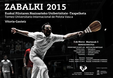 ZABALKI 2015 se desarrollará el jueves, 5 de marzo, en las instalaciones municipales de los frontones de Astrónomos y Beti-Jai de Vitoria-Gasteiz. Durante la mañana se disputarán las fases clasificatorias y a la tarde se jugarán las semifinales y finales. Las modalidades en competición serán: paleta argentina (masculina y femenina), frontenis parejas (masculina y femenina), mano parejas, mano individual (cuatro y medio) y paleta cuero.