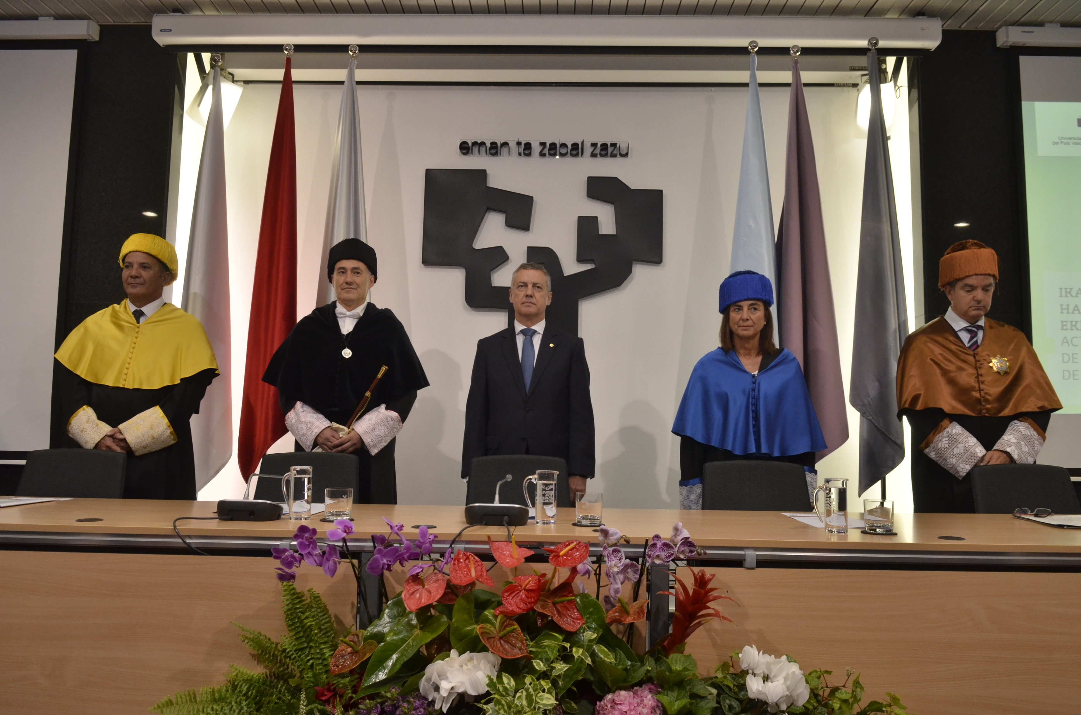 El acto ha concluido con las intervenciones del rector de la Universidad del País Vasco, Iñaki Goirizelaia, y del lehendakari del Gobierno Vasco, Iñigo Urkullu. En su discurso, el rector ha destacado que durante este año académico se diseñará el Plan Estratégico de los Estudios de Grado "para que la oferta académica de nuestra universidad responda a las necesidades de la sociedad vasca, y que lo haga sin que por ello aumente el coste que supone al alumnado. Debemos obrar con prudencia, pero al mismo tiempo con decisión e ideas claras: así, valoraremos los resultados obtenidos y, a continuación, diseñaremos el Plan Estratégico de los Estudios de Grado, con criterios propios y en colaboración con todos los agentes implicados".