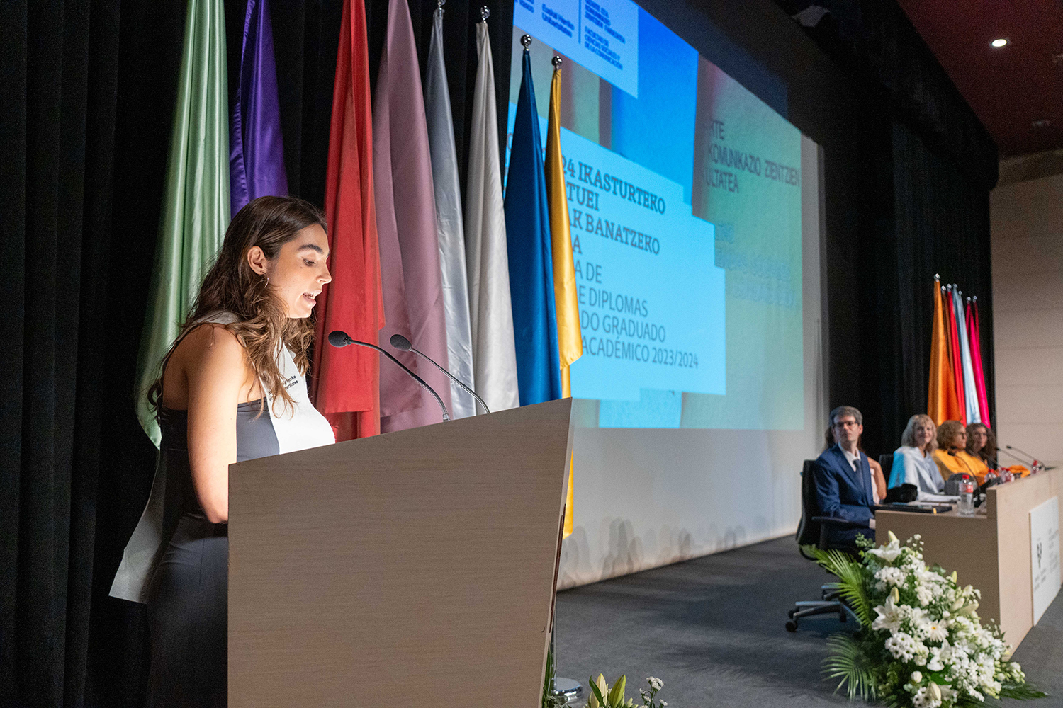 El centro homenajeó en el acto a los mejores expedientes: Pablo Maroño Turnes (no asiste), en el Grado en Periodismo; Javier Navarro de Almeida, en el Grado en Publicidad y Relaciones Públicas; Jone Aranberria Etxeandia, en el Grado en Comunicación Audiovisual; Askoa Uriarte Fernández de Olano, en el Grado en Sociología y Ane Lapitz Kaltzada, en el Grado en Ciencia Política y Gestión Pública.