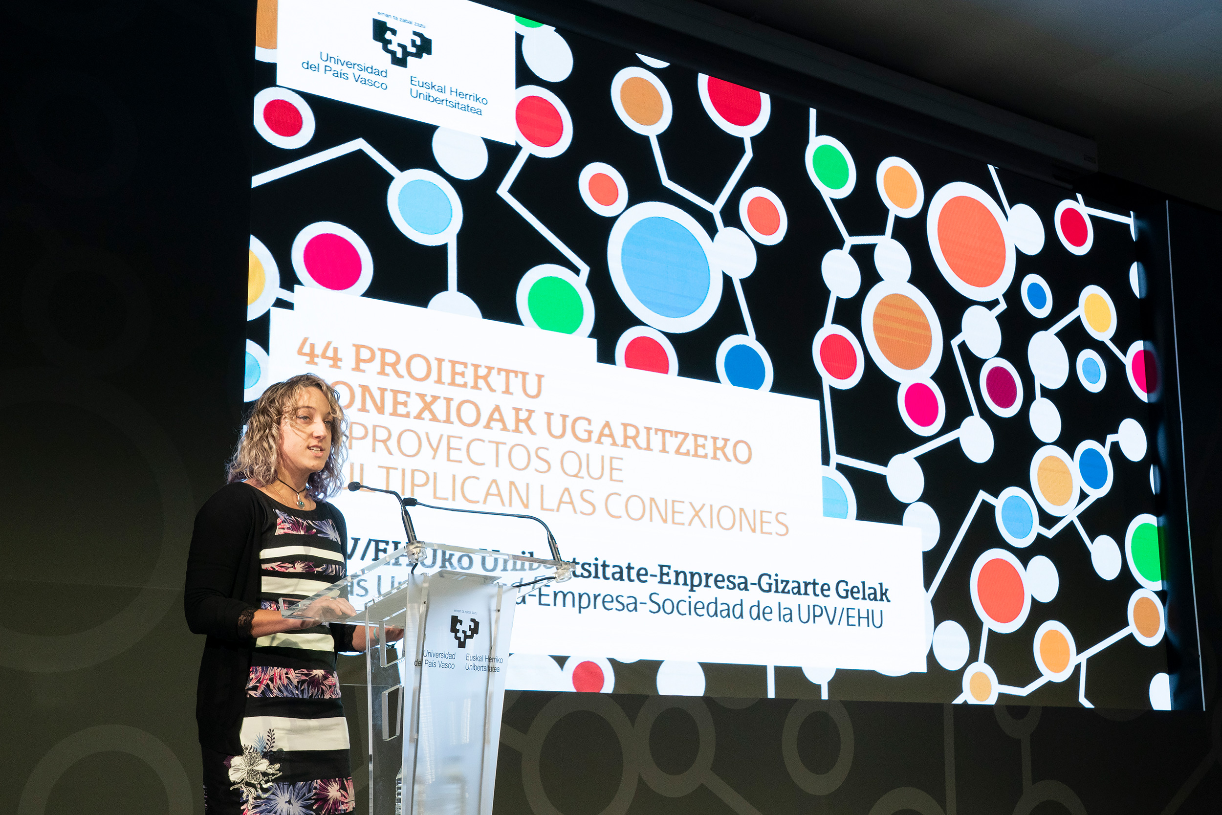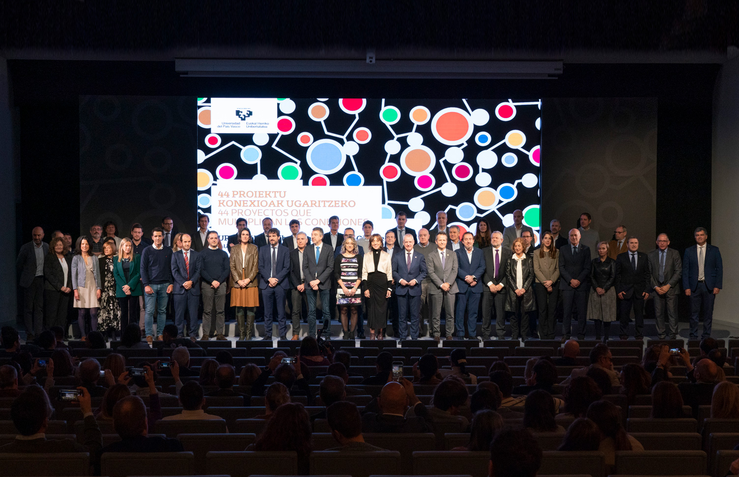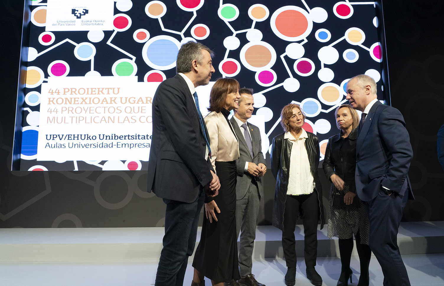 La Universidad del País Vasco ha presentado hoy, 27 de noviembre, una de las iniciativas en las que es pionera y a la que ha dado un especial impulso en los últimos años: las Aulas Universidad-Empresa-Sociedad. En el marco de la actividad académica, estas aulas añaden al binomio clásico (formación e investigación) el concepto de transferencia del conocimiento. El acto, titulado '44 proyectos que multiplican las conexiones', ha estado presidido por el lehendakari Iñigo Urkullu y la rectora Eva Ferreira.