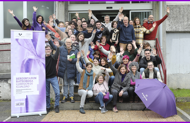 Como todos los años, el alumnado, Personal Docente e Investigador y Personal de Administración y Servicios de nuestra Facultad de Psicología nos hemos reunido para la foto grupal en favor del 8M. Foto: Laura del Campo. Facultad de Psicología. UPV/EHU. -