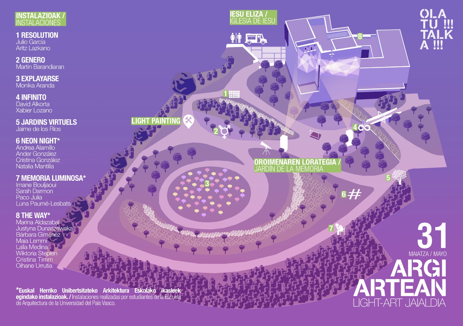 Argiartean propone un diálogo con el paisaje, con la arquitectura y con la ciudadanía en un enclave, el Jardín de la Memoria, especialmente cargado de significación. Un espacio en el que evocar imágenes y emociones que se expresen en torno al concepto de la memoria en su significado más universal. Además de las instalaciones light art, tanto el jardín como la iglesia albergarán una programación heterogénea y dinámica en la que disciplinas como la música, la poesía, el vídeo-arte o incluso la astronomía se pondrán en estrecha relación con la iluminación.