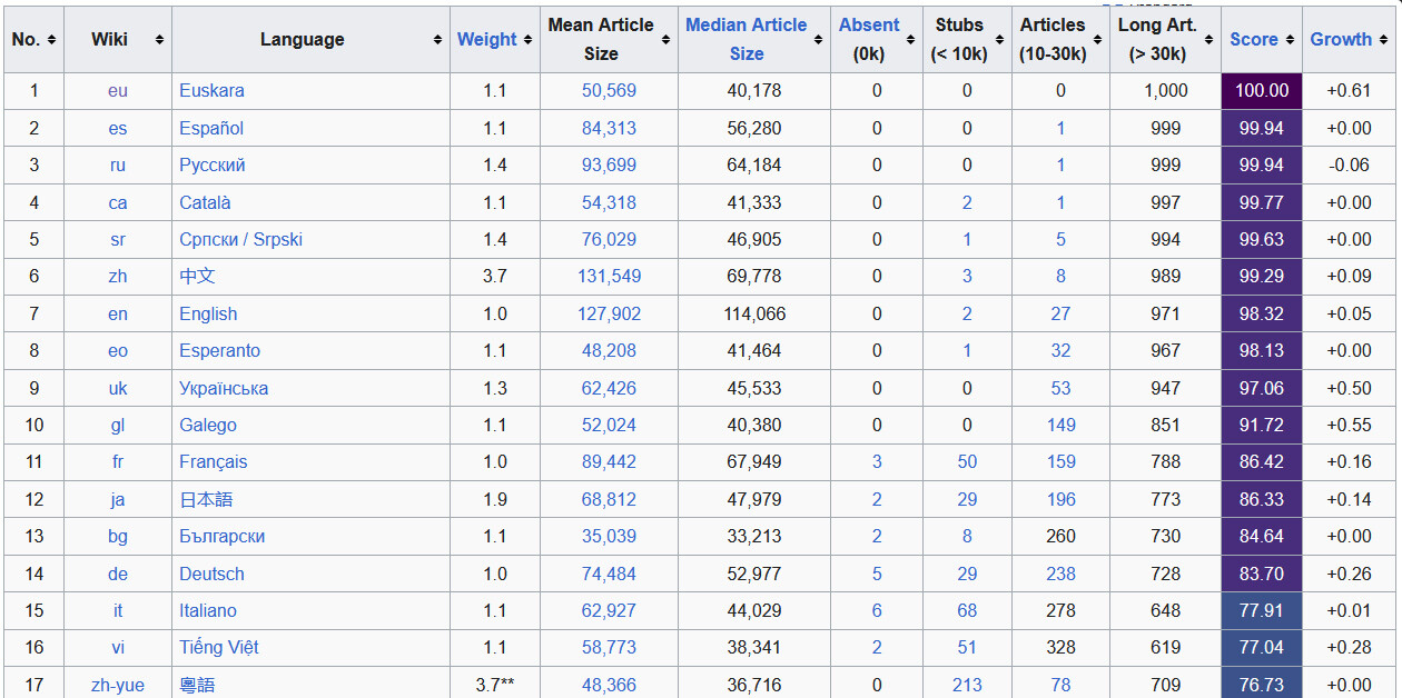 Los 1.000 artículos básicos y esenciales que deberían tener todas las wikipedias se concretan en un debate entre wikilaris de todo el mundo, con el objetivo de que todas las lenguas tengan aquellos que conforman un conocimiento general básica. En euskera ya están, y además cumplen también la exigencia de que sean artículos largos, es decir, que tengan más de 30.000 bytes. Y el euskera ha sido la primera lengua que ha conseguido ese reto. El siguiente será mejorar otra lista más amplia de 10.000 artículos. A día de hoy, en la lista de los 10.000 artículos que debe tener toda Wikipedia, el euskera está en puesto 17.