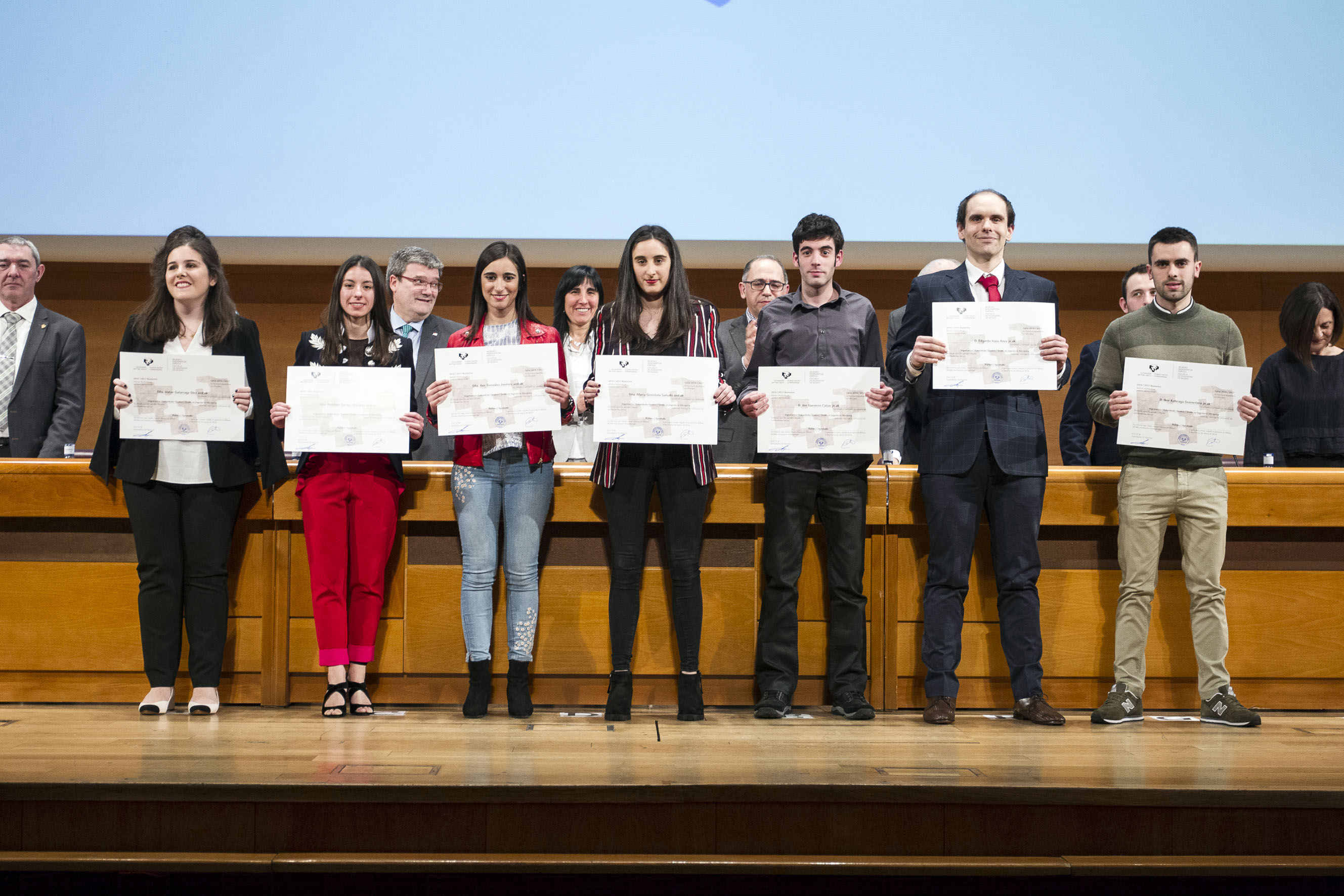 Entre los 798 que han recibido su diploma, 628 son graduados en diferentes titulaciones y 170 de másteres. Entre ellos, 28 estudiantes han obtenido además una doble titulación, sumando al título de la Escuela el conseguido en universidades de países como Gran Bretaña, Francia, Suecia o Estados Unidos, con las que la Escuela tiene firmados acuerdos. Estos estudiantes han compaginado sus estudios en la escuela universitaria bilbaína con su formación en centros extranjeros: 16 en Cranfield (Reino Unido), 7 en Illinois Institute of Technology (EE UU), 4 en Gävle (Suecia) y 1 en ENSAM (Francia).