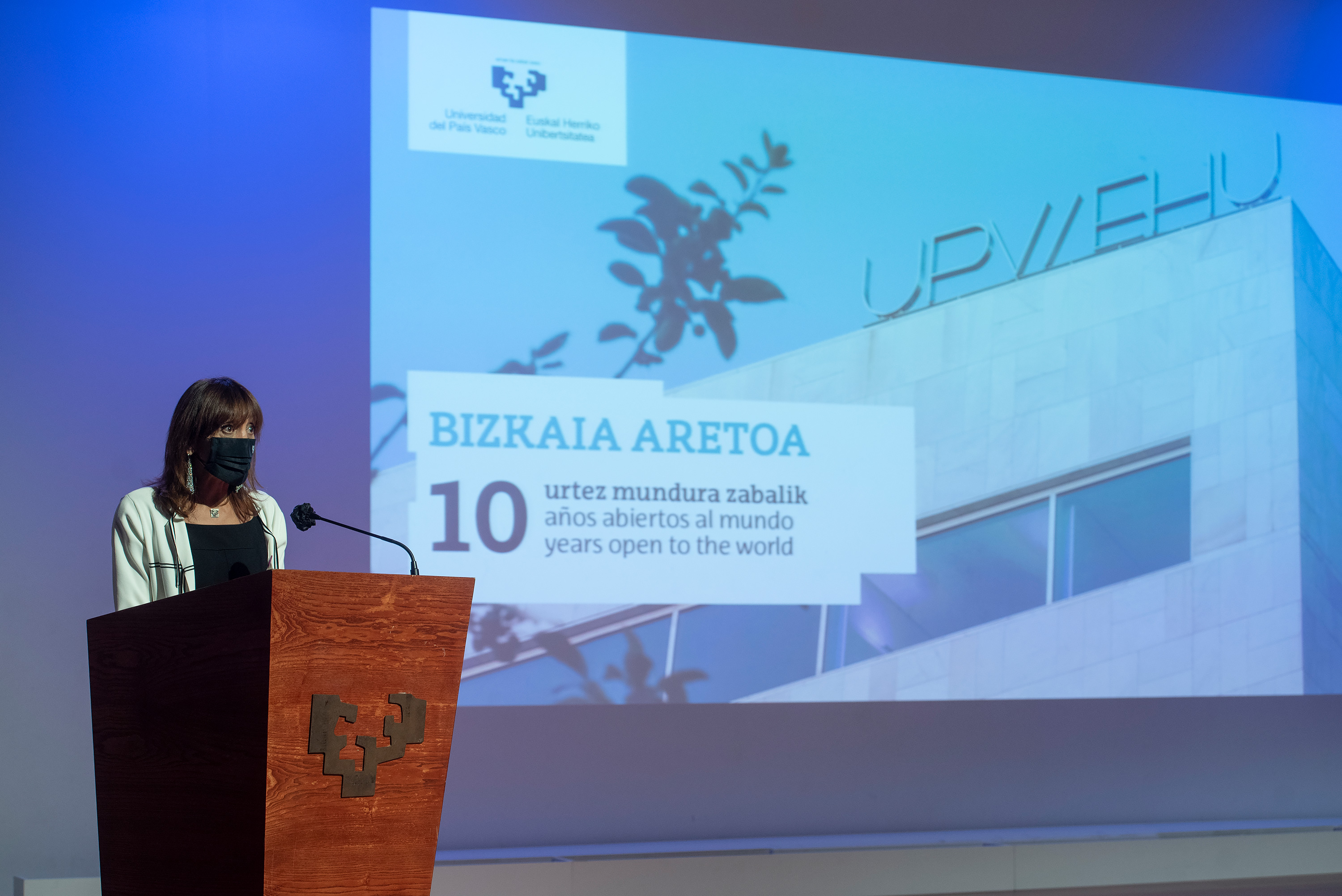 La rectora de la UPV/EHU, Eva Ferreira, ha cerrado el acto. En su intervención, ha subrayado la relevancia que ha adquirido este edificio no solo en la actividad académica de la universidad, sino también en el mapa urbanístico, social y cultural del País Vasco: “no es fácil –ha señalado- que un edificio adquiera en tan breve período de tiempo el carácter emblemático, simbólico, que ostenta Bizkaia Aretoa en Bilbao y en el conjunto del País Vasco. Bizkaia Aretoa identifica a la UPV/EHU: nos identifica como comunidad universitaria. Estar en el núcleo de Bilbao nos ha hecho más visibles para la sociedad, pero también nos ha permitido estrechar relaciones con el mundo cultural y artístico vasco. Y celebramos estos diez años con orgullo por lo que hemos hecho, pero también con la esperanza puesta en lo mucho que queda por hacer”.