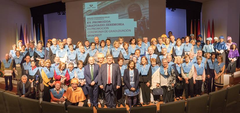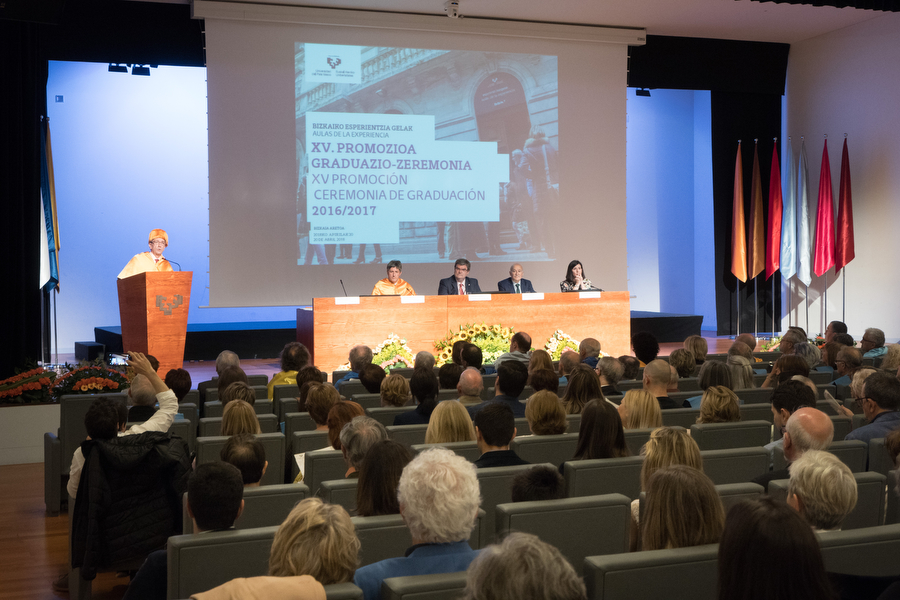 En el auditorio Mitxelena de Bizkaia Aretoa, las personas que integran la decimoquinta promoción y sus familiares asistieron al acto, junto con el vicerrector del Campus de Bizkaia Patxi Juaristi, el alcalde de Bilbao, Juan Mari Aburto, el director general de BBK Gorka Martínez Salcedo y el director de las Aulas de la Experiencia de Bizkaia, Alfonso Unceta. El acto de graduación finalizó con la actuación del coro de las Aulas de la Experiencia dirigido por Oihana Reguela. Bizkaia fue el primer campus en el que la UPV/EHU puso en marcha las Aulas de la Experiencia, la Universidad para mayores de 55 años, en el curso 1999-2000. Este año, la decimoquinta promoción ha estado formada por 71 estudiantes (45 mujeres y 26 hombres).