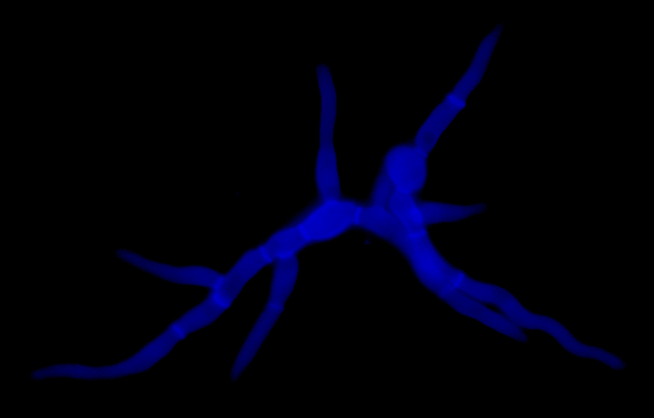 Crecimiento de Lomentospora prolificans. Tinción fluorescente del hongo (en azul; blanco de calcofluor) tras 8 horas de crecimiento a 37°C en medio líquido. -