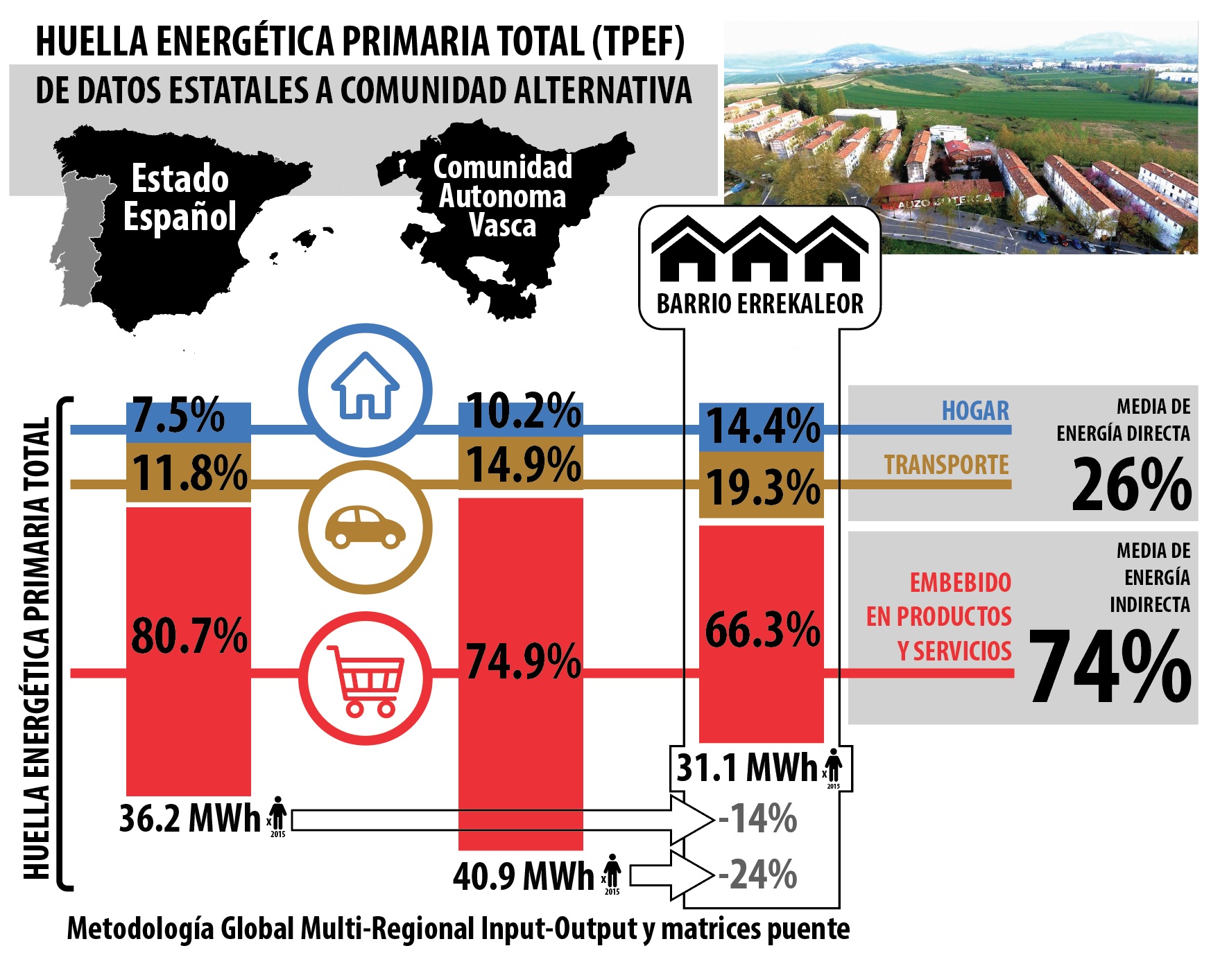 Los investigadores de la UPV/EHU han utilizado por primera vez la metodología Input-Output para calcular la huella energética a nivel regional (CAPV) y local (barrio de Errekaleor, en Vitoria-Gasteiz, que es la mayor comunidad eléctricamente independiente del País Vasco). Así, se ha demostrado, por un lado, que la metodología es adecuada para calcular las huellas energéticas a nivel de barrio, región, comunidad o incluso estatal; por otro lado, que la huella energética nos proporciona, en la era globalizada actual, una medición más precisa de los patrones de consumo de energía; y, por último, que la forma de vida comunitaria alternativa genera una menor huella energética.