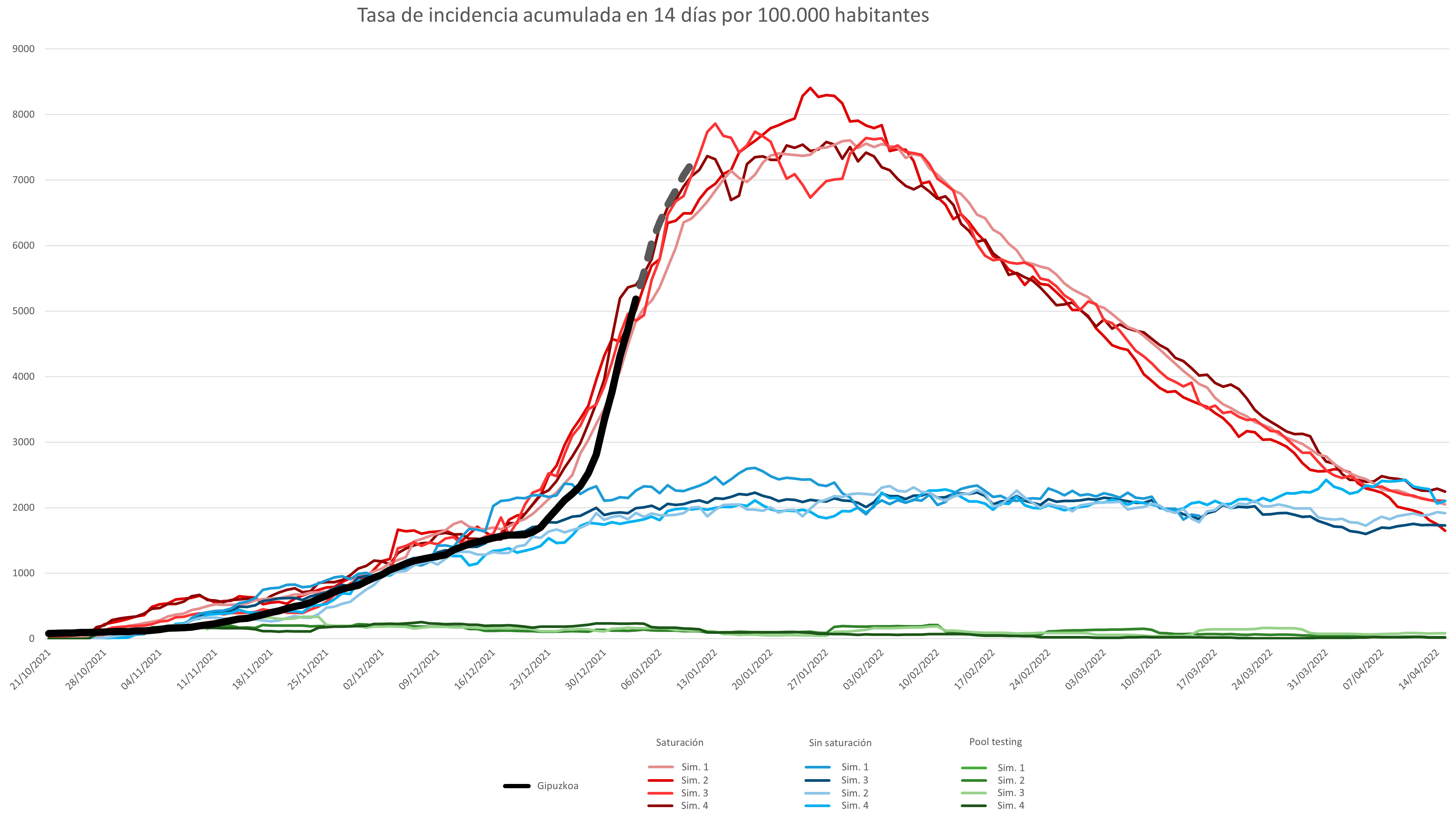 Figura 1: En rojo: Simulaciones en condiciones de sistema de rastreo saturado. En azul: Simulaciones en condiciones de siste ma de rastreo no saturado. En verde: Simulaciones con técnicas de rastreo basado en técnicas de Pool Testing. En negro y gris: Datos registrados en Gipuzkoa