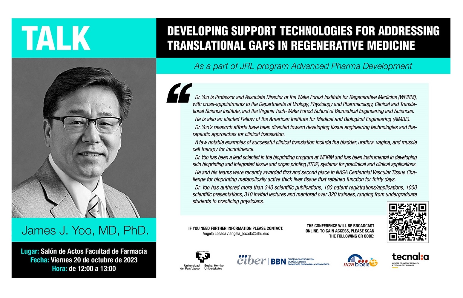 La Facultad de Farmacia de la Universidad del País Vasco acogerá la conferencia del doctor James J. Yoo titulada ‘Developing support technologies for addresing translational gaps in regenerative medicine’ (Desarrollar tecnologías de apoyo para abordar las brechas traslacionales en la medicina regenerativa).