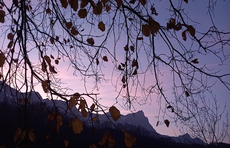 Después de veinte días de lluvia ha reaparecido la silueta de las montañas. Con la puesta de sol el color malva pone una vez más de relieve que cada día es diferente en la naturaleza, los colores cambian y todo parece distinto.