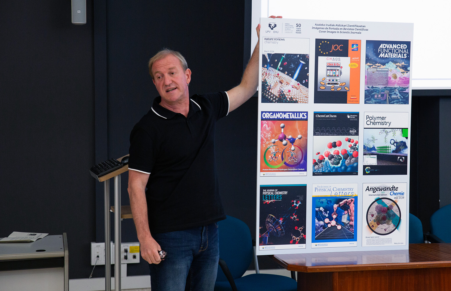 La Facultad de Química de la Universidad del País Vasco celebró la segunda edición del KF Eguna – Día de la Facultad de Química, acto organizado por la Comisión de Comunicación del centro universitario. Durante el evento, Guillermo Roa, Doctor en Química, divulgador científico y responsable del programa de Euskadi Irratia, Norteko ferrokarrila, así como Nagore Rementeria, licenciada en Química y directora del programa Teknopolis en la ETIB, ambos ex alumnos del centro, disertaron sobre su trayectoria profesional.